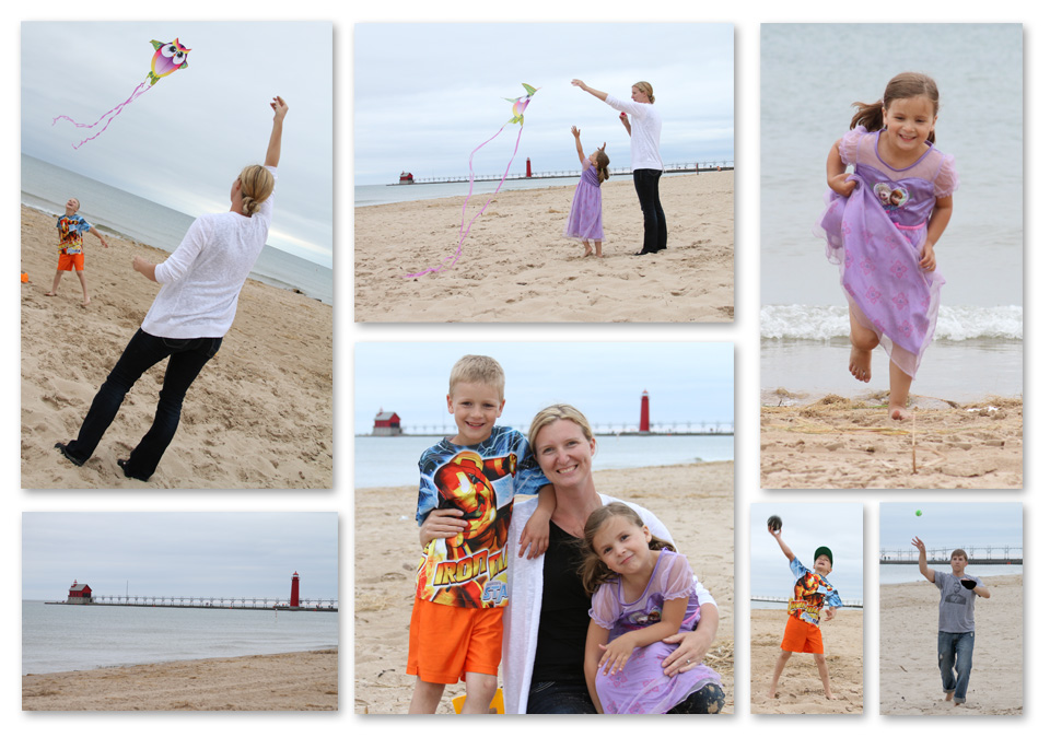 Friday night we spent time playing at Grand Haven State Park. The temperature was in the low 70s and it was overcast and windy, so we had the beach to ourselves! We flew a kite, dug holes with our new sand toys, played catch and our son joined a game of volleyball with some sweet teenage girls.